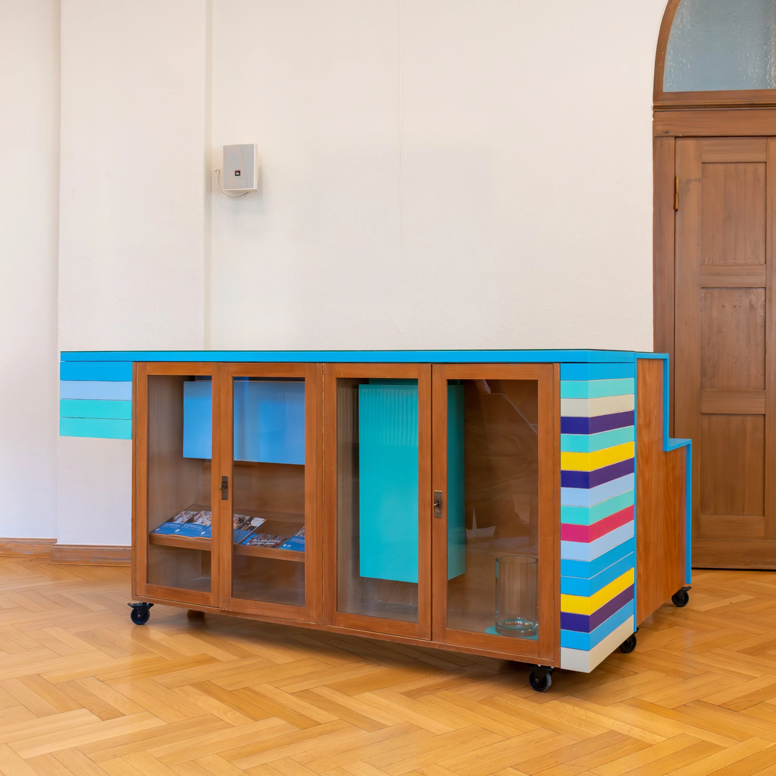 A: Sie ist ein Empfangstresen, aber auch Bar mit Kühlschrank und bietet Stauraum. Wichtig war auch, dass das Möbelstück auch mobil ist.